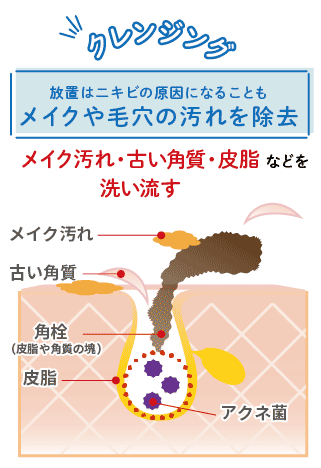 - メイクを落とすとともに、余分な皮脂やメラニンを含む古い角質も洗い流すことで、ニキビやその一因となる毛穴詰まりを防ぎます。