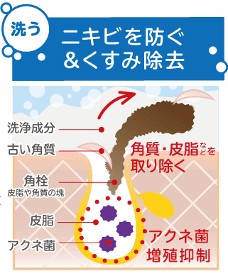 - アクネ菌の増殖を防ぐとともに、洗浄によって余分な皮脂やメラニンを含む古い角質を取り除き、ニキビを防ぎながらくすみ知らずの透明感のある素肌へと導きます。